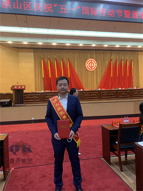 2023年4月28日武汉市洪山区召开庆祝“五一”国际劳动节暨全区“优秀劳动者”通报表扬大会,141人获评全区“优秀劳动者”。青开建设集团项目部人员张兵同志荣获“洪山区优秀劳动者”荣誉称号。